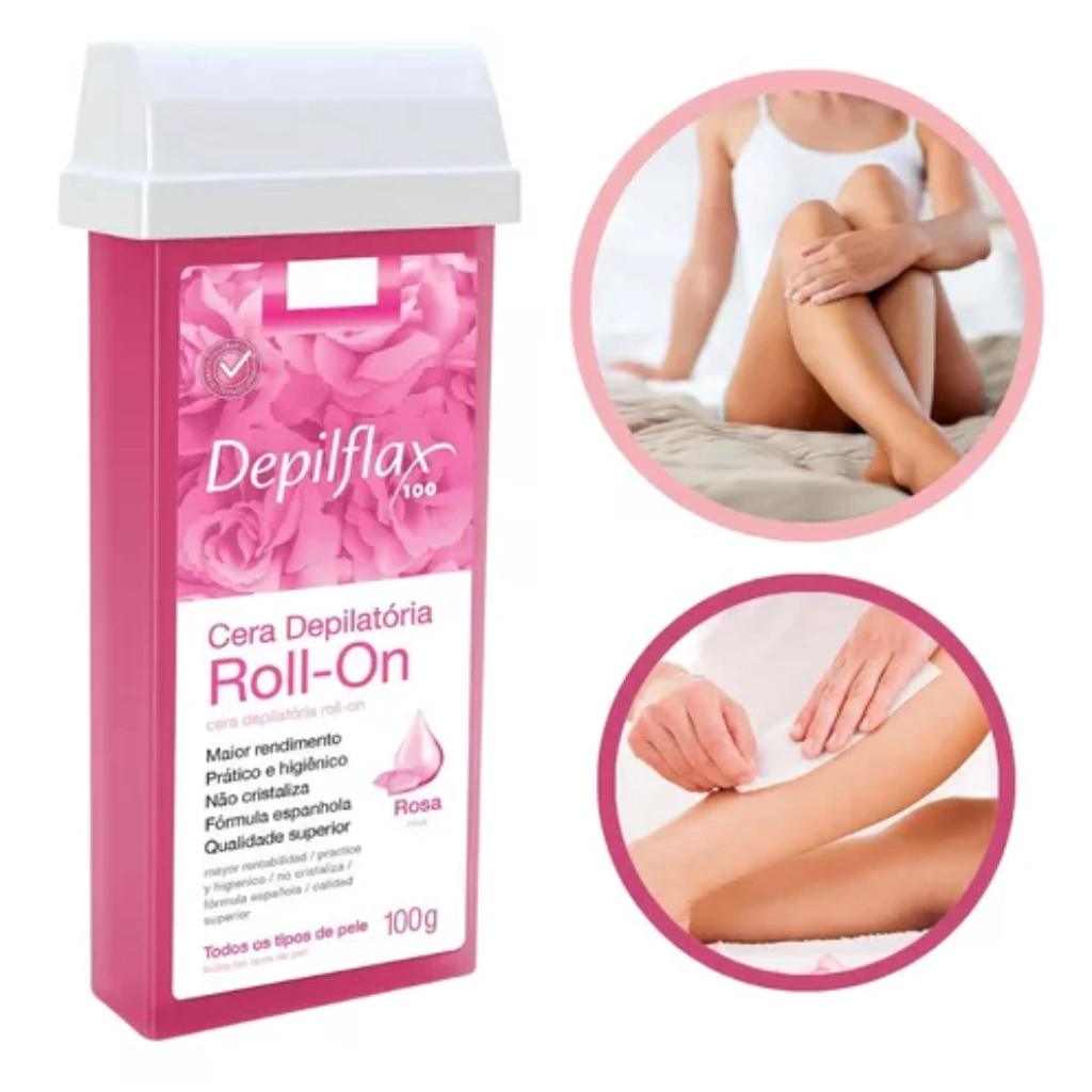 Contém: 1 Cera Depilatória Depilflax Roll-on Rosa 100g.
